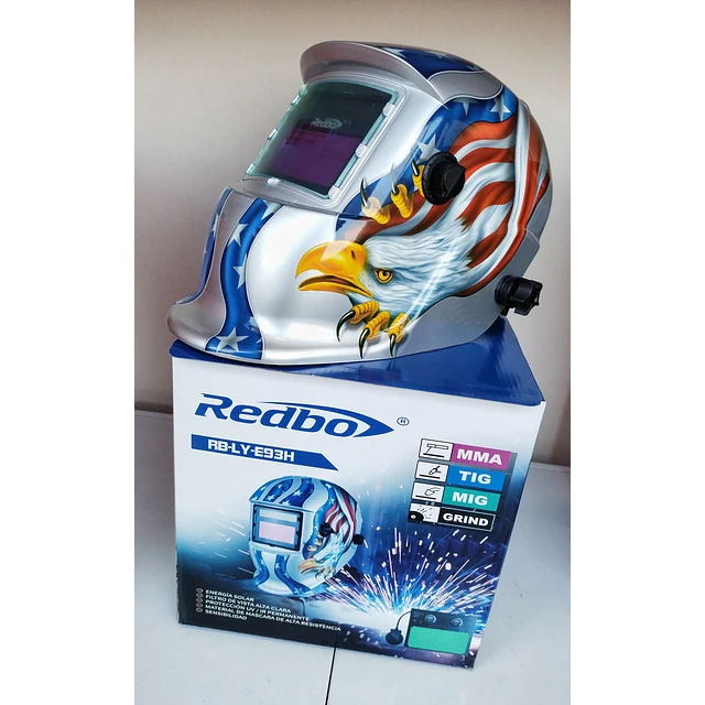 La máscara fotosensible RB-LY-E26 de Redbo, es una máscara de uso profesional con batería de carga de energía solar y litio, filtro de vista alta clara, protección UV/IR de forma permanente, con un material de alta resistencia brindando mayor seguridad, sirve principalmente para realizar soldaduras con herramientas, MMA, TIG, MIG Y GRIND.